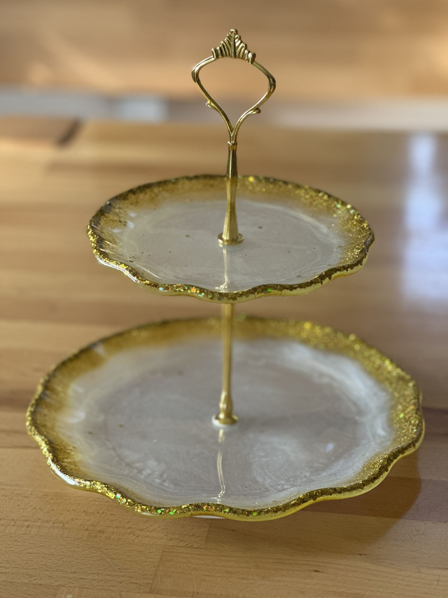 ✨ 2-stöckige Etagere aus Epoxidharz – Weiß-Gold mit Glitzer ✨