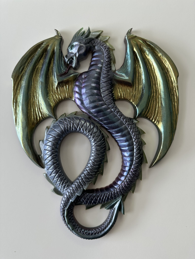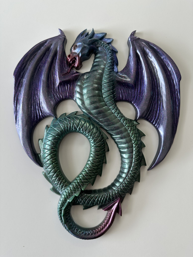 Verleihe deinem Zuhause einen Hauch Fantasie mit diesem einzigartigen Drachen-Wandschmuck aus hochwertigem Epoxidharz. Mit seinen schimmernden Farben und der detailreichen Gestaltung wird dieser majestätische Drache garantiert zum Blickfang in jedem Raum.